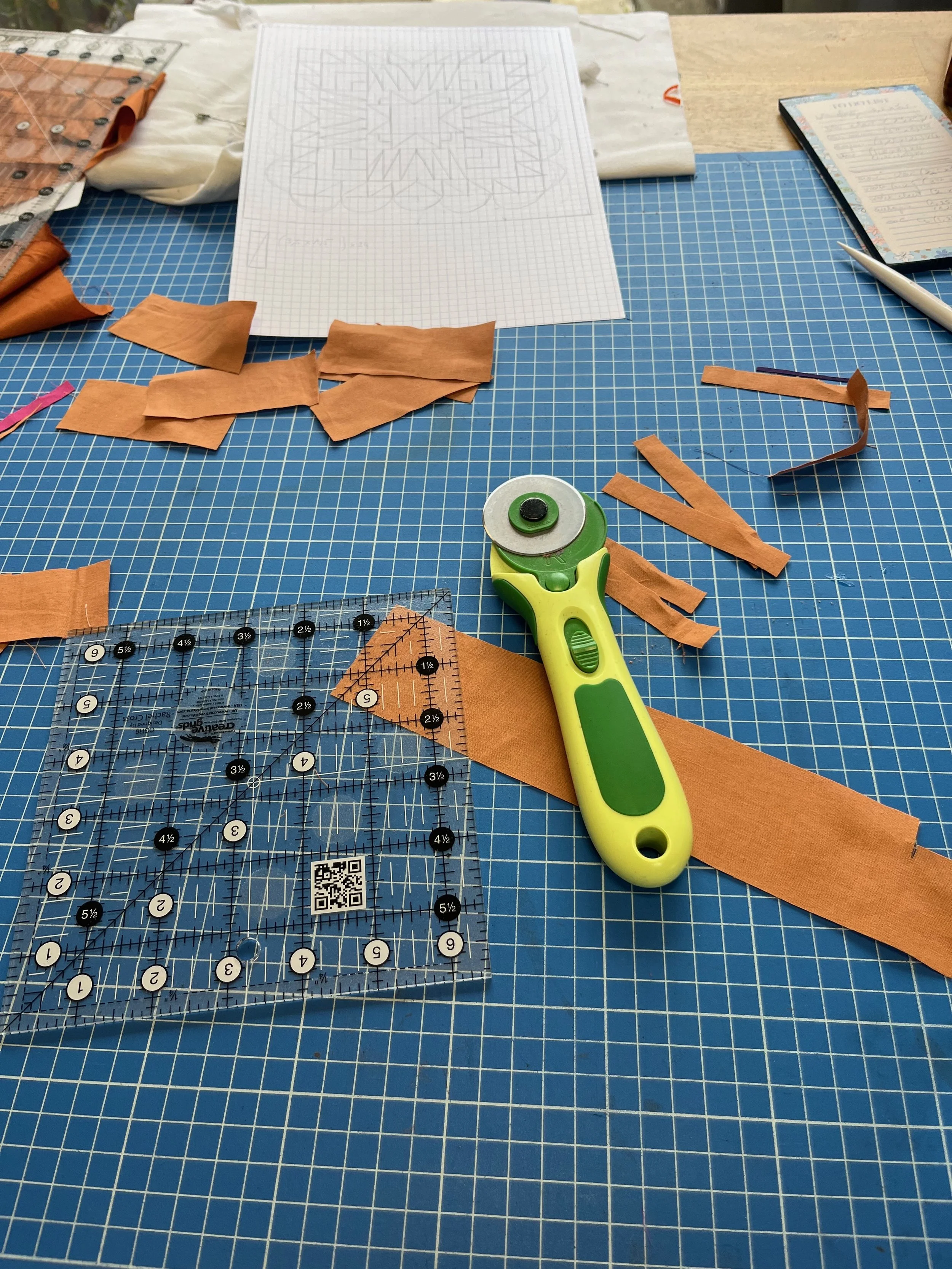 Je délaisse les centimètres pour travailler en inches avec mes fidèles alliés : le cutter rotatif et la règle de coupe.